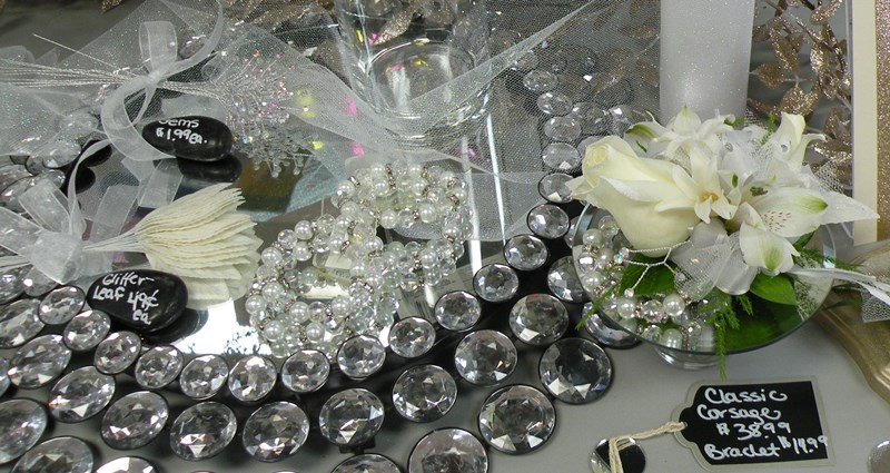 - Extra Accessories. We offer many options for customizing your prom pieces. One popular accessory is flower glittering, which can be done in any color to match your color scheme. Other accessories also include rhinestones, gold and silver leaves, feathers, and faux pearls. These extra touches make your pieces unique and tie each component of your look together.