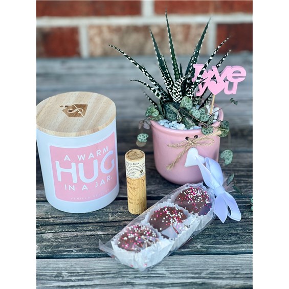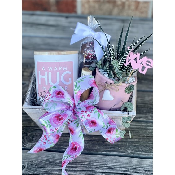 Presented in a white-washed wooden gift box and finished with a romantic rose-printed ribbon sash, this gift blends living beauty with cozy indulgences. At the center is a charming pink ceramic planter, accented with a sweet heart charm and planted with string of hearts and haworthia--a pairing that's both whimsical and easy to love.