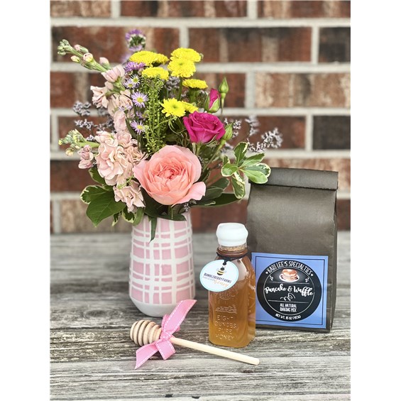 At the heart of the gift is a pink stoneware vase filled with a wildflower-inspired arrangement--soft, cheerful, and effortlessly gathered. Paired alongside are cozy breakfast essentials: a small-batch waffle and pancake mix, a vintage-style glass bottle of pure clover honey sealed with beeswax, and a classic wooden honey dipper tied with a delicate ribbon.