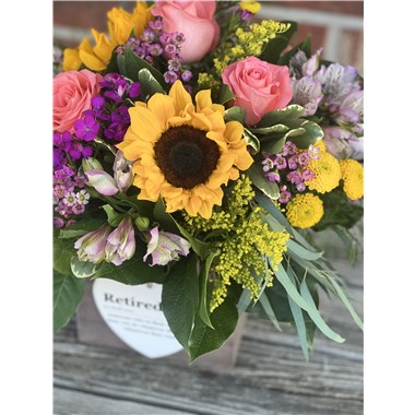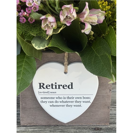 Celebrate the sweet freedom of retirement with our Heartfelt Blooms - Retired floral arrangement. Designed in a natural wood cube overflowing with bright, cheerful blooms, this thoughtful gift includes a ceramic heart tag with a jute hanger.