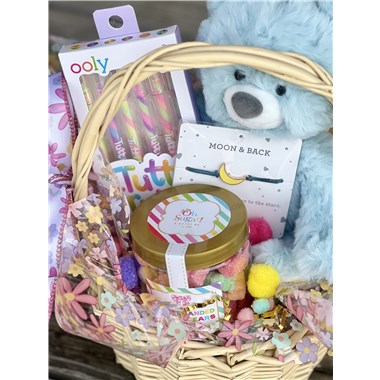 This delightful set features Demdaco's soft, huggable companion adorned with a moon charm bracelet and a heartfelt tag that reads, "Moon and Back--My love for you reaches to the stars." To inspire their creativity, we've included a 6-pack of Tutti Frutti scented swirl gel pens, adding a burst of color and delightful scents to their artistic projects. And for a sweet treat, they'll enjoy a 7 oz jar of Oh Sugar's sweet sanded gummy bears, offering a delicious assortment of gummy delights. All these treasures are nestled in a vibrant wicker basket, adorned with festive cellophane, shredded filler, and a sprinkle of mini pom-pom deco, all tied up with a cheerful taffeta ribbon. It's the perfect way to remind your child that your love for them knows no bounds.