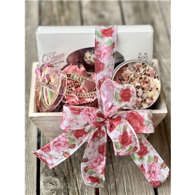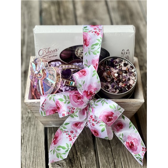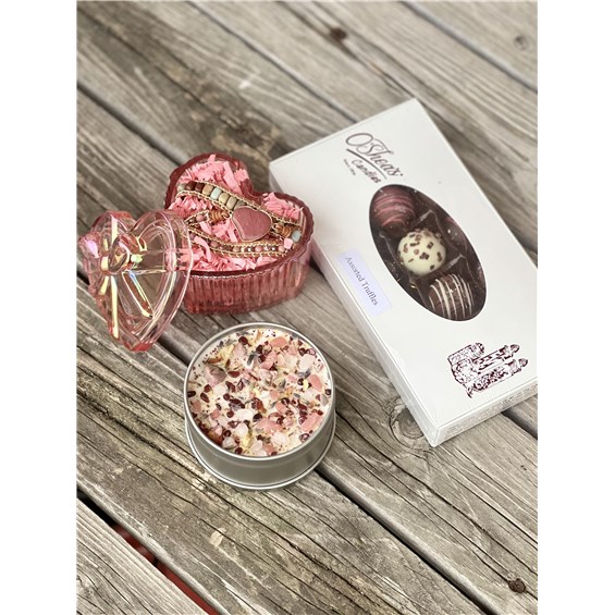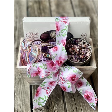 This beautifully presented gift arrives in a white-washed wooden box tied with a romantic ribbon bow and is filled with thoughtfully curated luxuries. Inside, they'll discover a 15 piece box of assorted handmade truffles from O'Shea's Chocolates, a romantic crystal candle from New Moon Beginnings crafted with intention, and a stunning boho wrap beaded bracelet from Free Spirit Shop featuring a natural crystal heart centerpiece.