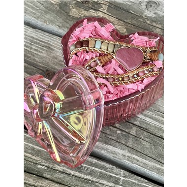 The bracelet is elegantly presented in a pink iridescent glass heart keepsake jewelry box, adding an extra layer of romance. Bracelet styles are assorted and may include: Amethyst heart with Amethyst beads, Rose Quartz heart with Amazonite beads, and Rhodonite heart with Jasper beads. Each crystal style carried its own unique energy and beauty, making every Lovestruck gift feel personal and one-of-a-kind. If you have a preferred crystal, we invite you to call the shop for availability--we're always happy to do our best to accommodate special requests when possible.