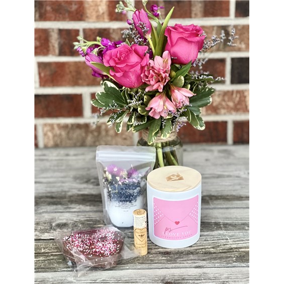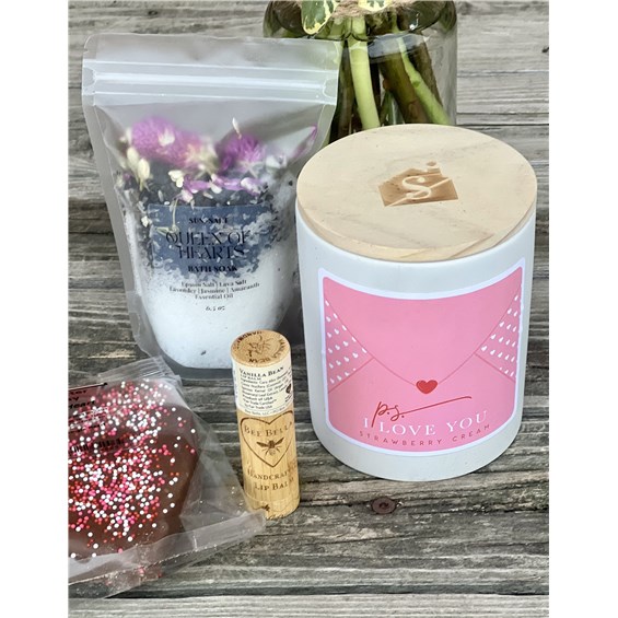 To sweeten the sentiment, we've included a giant peanut butter heart from O'Shea's Chocolates, finished with festive sprinkles--because love should be a little indulgent. The experience is completed with botanical bath salts, nourishing Bee Bella lip balm, and a cozy Strawberries & Cream soy wax candle to set the mood.