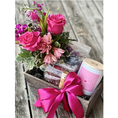 Presented in a dark-stained wooden box tied with a luxurious satin ribbon bow, this romantic gift pairs timeless florals with sweet indulgences. At the heart of the box is a charming middy glass vase with jute accent, filled with a lush mix of roses, stock, alstroemeria, and tulips--soft, expressive blooms that speak volumes.