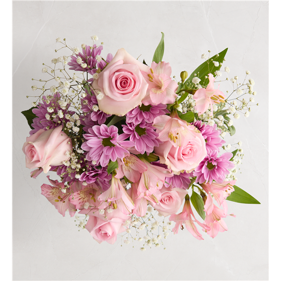 Pretty in pink, with touches of lavender, this arrangement is as inviting as a gentle breeze on a warm, sunny day. The white ceramic vase, crafted to resemble a flower wrap tied with a bow, adds to the timeless charm.