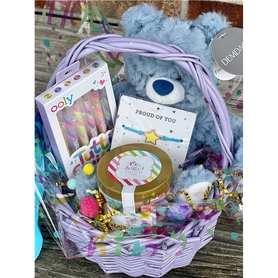 This thoughtfully curated set features Demdaco's cuddly "Proud of You" turquoise bear, complete with a wearable bracelet and heartfelt tag that reads, "Proud of you--look at you go!" To inspire creativity, we've included a 6-pack of Tutti Frutti scented swirl gel pens, adding a splash of color and delightful scents to their artistic endeavors. And for a sweet treat, enjoy the 7 oz jar of Oh Sugar's Sweet Sanded Gummy Bears. All these goodies are nestled in a vibrant wicker basket, adorned with festive cellophane, shredded filler with a sprinkle of mini pom-pom deco, and tied up with a colorful taffeta ribbon. It's the perfect way to show how proud you are and to celebrate their special moments!