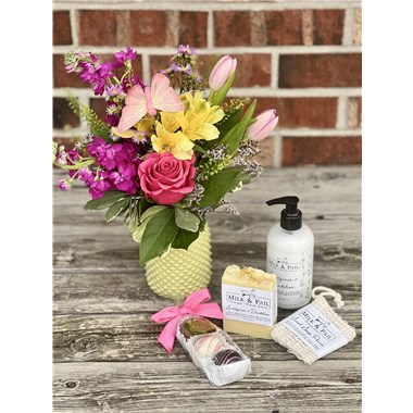 Our Signature Gift Box: Spring Edition is everything she deserves, all wrapped up in one sweet surprise. We've updated this customer favorite with cheerful spring color, each accented with a floral ribbon sash and charming butterfly accent. Inside the white-wash wooden box, we've tucked in a petite vase of colorful seasonal blooms to brighten her day, along with handmade goat milk lotion and soap for a little at-home pampering. There's even a natural soap saver bag to complete the spa moment. And of course, no gift is complete without a treat--so we included handmade truffles from O'Shay's Candy Co. for the perfect finishing touch. Thoughtful, beautiful, and completely ready to delight.