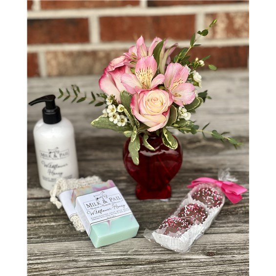 The finishing touch is a stunning red glass heart-shaped mini vase, filled with a romantic mix of fresh roses and alstroemeria--perfect for adding a pop of love to any space.