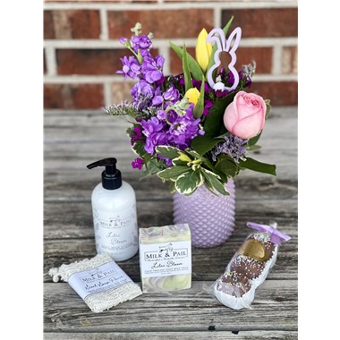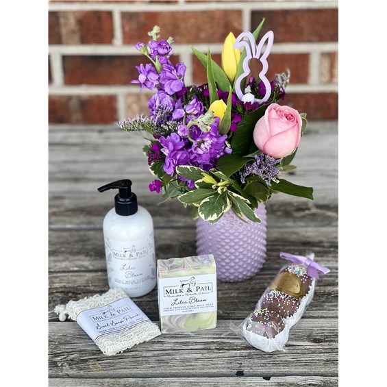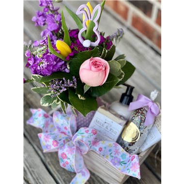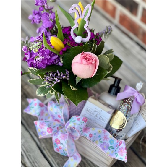 Our seasonal favorite returns with a fresh Easter twist. This signature gift box features a whitewash wooden box wrapped with a seasonal ribbon sash. Inside you'll find a mini fresh flower arrangement in spring blooms, sweetly accented with a bunny pick for a festive touch. Paired with our best-selling goat milk lotion, soap, and natural soap saver, plus a delicious vanilla caramel truffle trio topped with cheerful spring sprinkles.