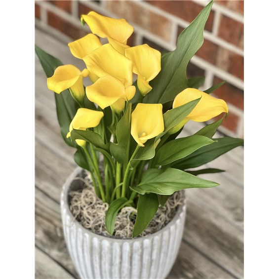 Clean lines and timeless blooms come together in the elevated spring piece. This premium calla lily is presented in sleek cement pottery featuring subtle vertical line detailing and a soft whitewashed finish, creating a refined and modern look.